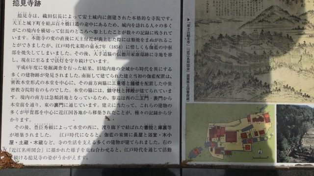 本能寺の変後に天主(天守)を始め主要な部分は消失してしまいましたが、当時の石垣や石段、また城内に信長が建立した摠見寺の二王門と三重塔が当時のまま残っています。