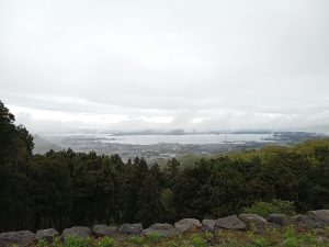 無事に楞厳寺山(りょうごんじさん)山頂に到着(220.86m)。頂上には電子レンジの格納庫が置いてあり、その中に登頂記録ノートが入っていましたので、記念に記入して、そのまま直進して下山。山の麓を歩いて搦手門へ。西峰を回って帰りは逆ルートで追手門を通って今回の登城が終わりました。